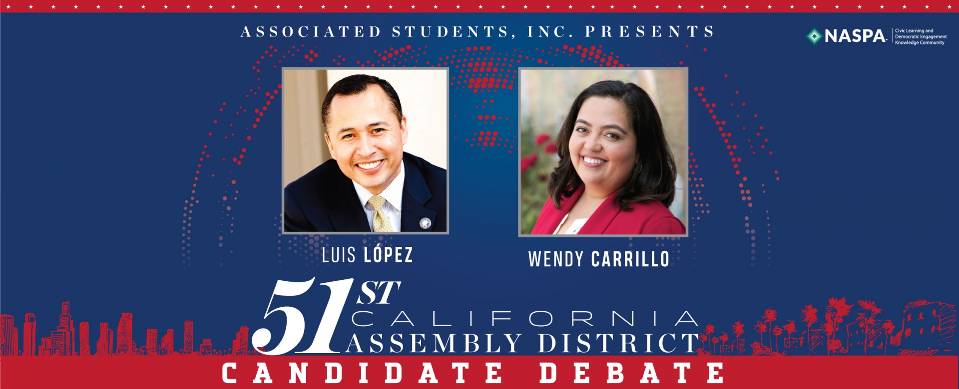 Join us for this unique student-led debate between the final two candidates in the upcoming special run-off election on December 5. The communities in Assembly District 51 include East Los Angeles, City Terrace, Chinatown, Cypress Park, Eagle Rock, Echo Park, Edendale, Glassell Park, Highland Park, Montecito Heights, Silver Lake, El Sereno, Lincoln Heights, Monterey Hills and Historic Filipinotown.