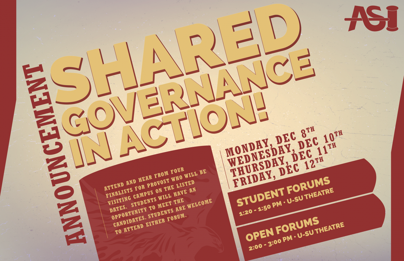 As part of the visit, there will be a “Student Forum” for students to have an opportunity to meet the candidates. The student forums are scheduled from 1:20-1:50 pm in the U-SU Theatre. Following the “Student Forum” will be an “Open Forum” from 2:00-3:00 pm which will be open to all including the students.