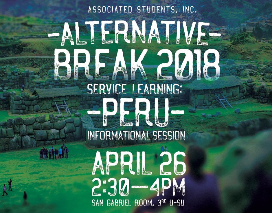 In partnership with EF Tours, A.S.I. is excited to offer you an amazing opportunity to travel with us on the Alternative Break Service Learning Trip to Peru in May/June 2018. We will explore Peru while completing service learning projects throughout our 10 day excursion and are looking for enthusiastic students to become global citizens for change. During the informational we will review the application process, itinerary, and pricing. This service trip is only open to current Cal State LA students. For more information, visit www.asicalstatela.org/peru.
